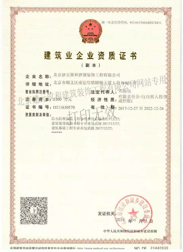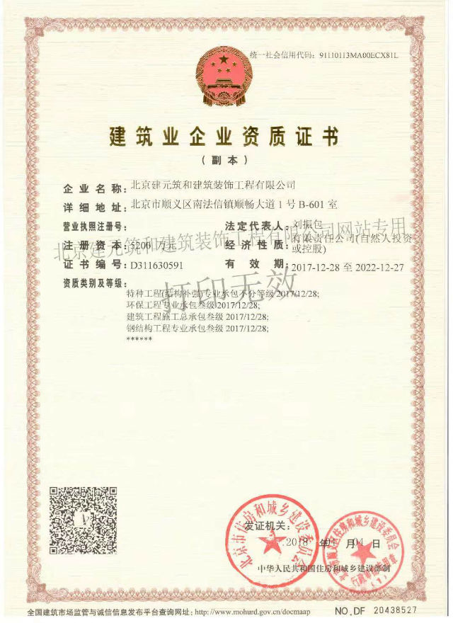 北京建元筑和建筑裝飾工程有限公司是經(jīng)中華人民共和國(guó)住房和城鄉(xiāng)建設(shè)部批準(zhǔn)的建筑裝飾施工企業(yè),創(chuàng)建于1998年2月,2017年5月獨(dú)立注冊(cè),注冊(cè)資金5200萬(wàn)元,集防水防腐保溫工程專(zhuān)業(yè)承包、建筑裝修裝飾專(zhuān)業(yè)承包、建筑幕墻專(zhuān)業(yè)承包、特種工程專(zhuān)業(yè)承包為一體的綜合性建筑企業(yè),是中國(guó)建筑防水協(xié)會(huì)會(huì)員單位,為"重合同、守信用"單位,并同時(shí)被金融機(jī)構(gòu)評(píng)估為"AAA"級(jí)資信企業(yè)。